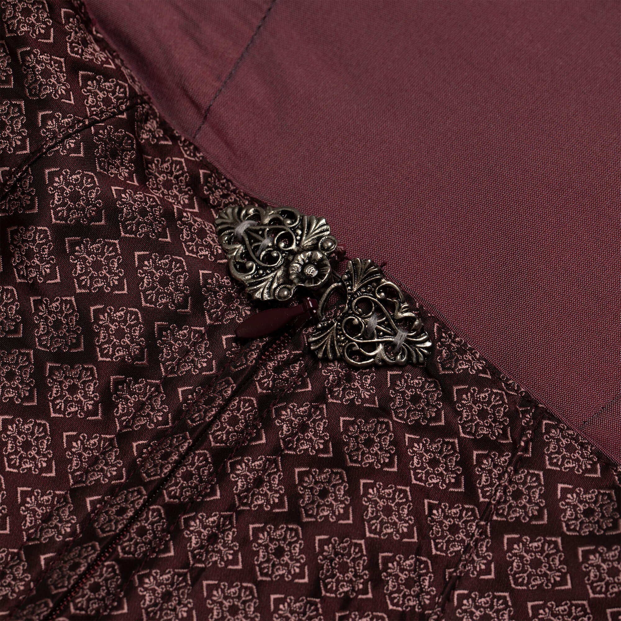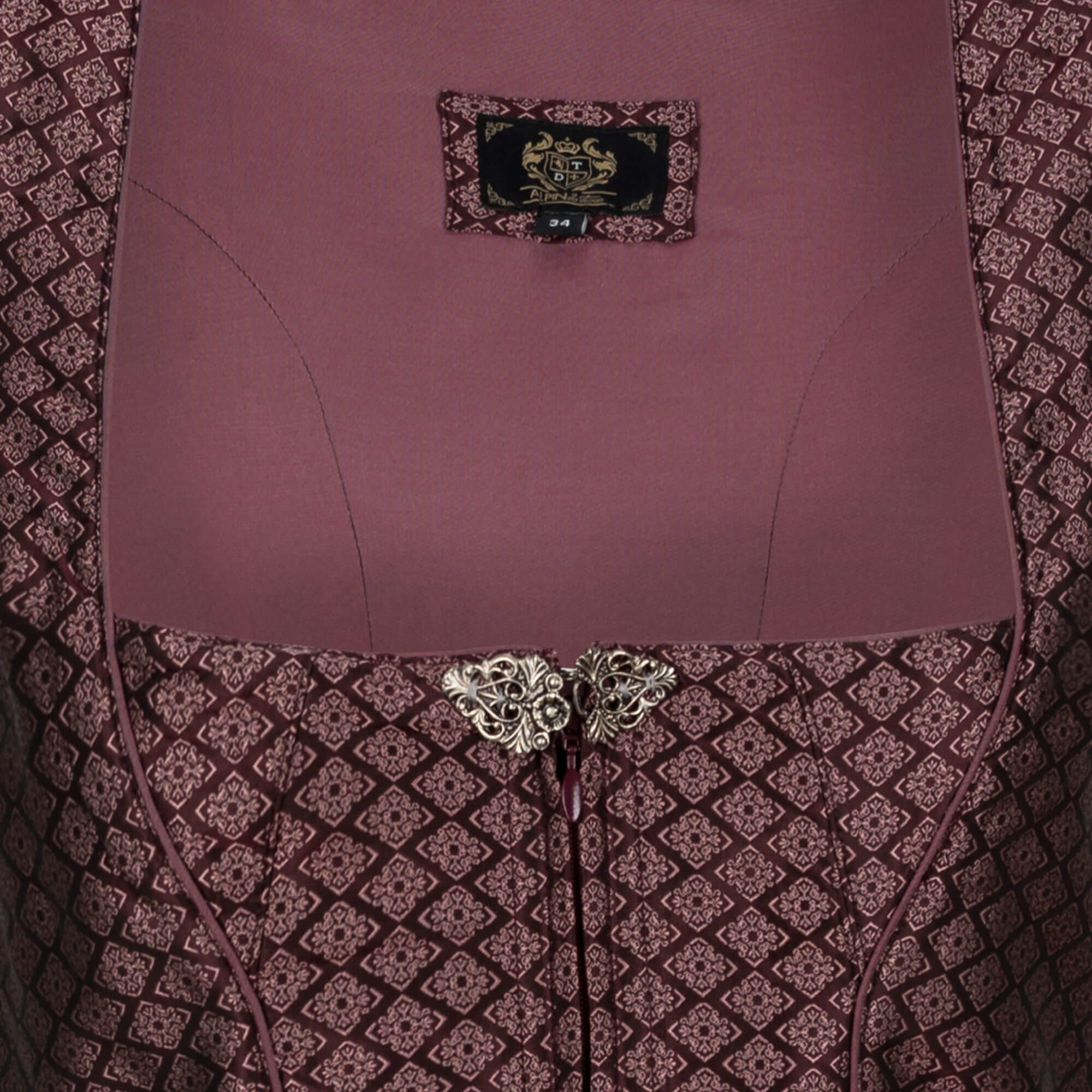 Ein Hauch von Nostalgie trifft auf modere Raffinesse: Das Dirndl "Camila" in Beere vereint traditionelle Elemente mit einem eleganten und zeitlosen Design. Der fein gemusterte Miederstoff zeigt ein edles Ornament-Dessin in Rosé auf beerigem Grundton. Feminin und detailverliebt.