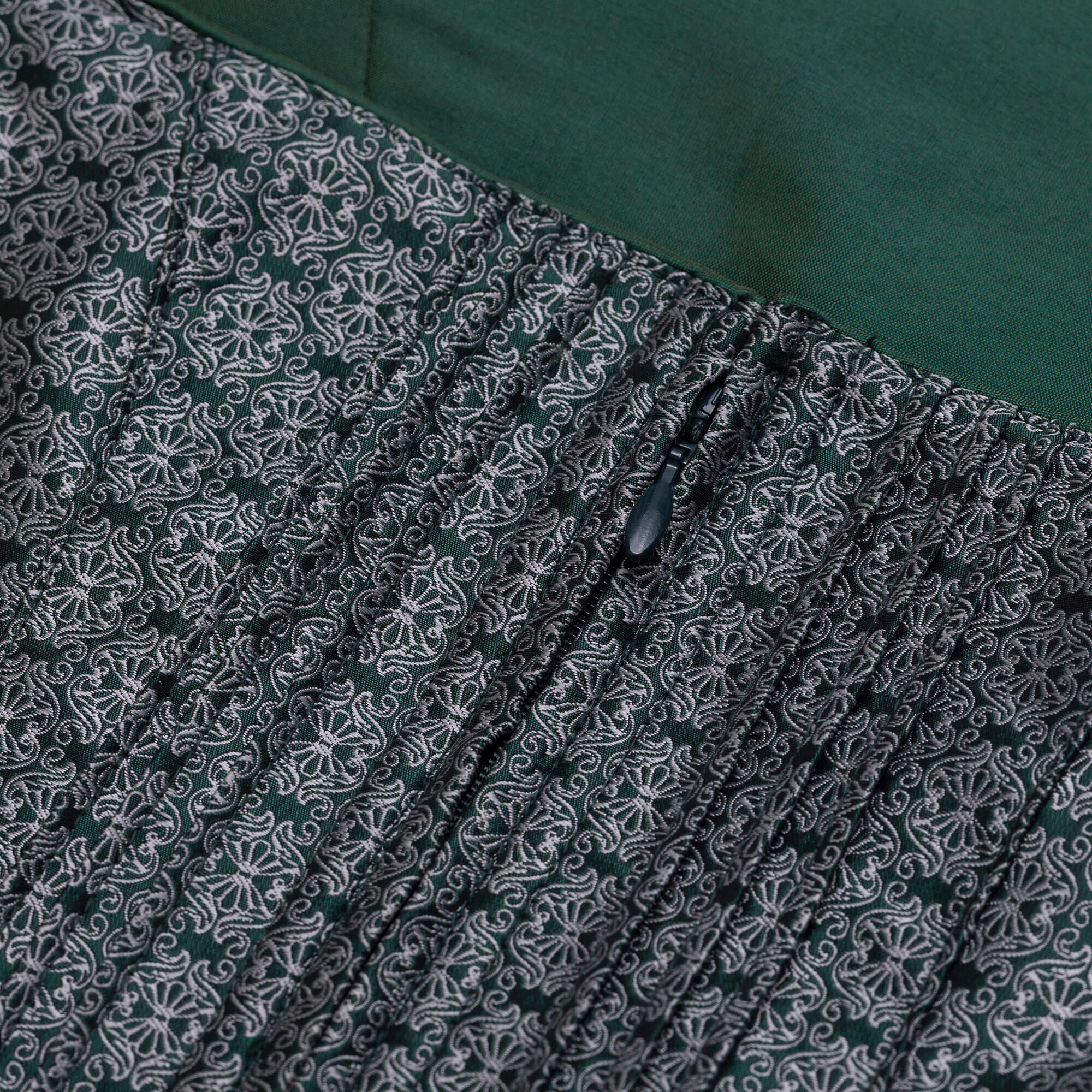 Dieses charmante Dirndl in einem satten Dunkelgrün vereint traditionelle Eleganz mit dezenten, modernen Akzenten. Das Mieder ist mit einem feinen, geometrischen Muster verziert und sorgt dank der formgebenden Schnittführung sowie dem verdeckten Frontreißverschluss für eine feminine und zugleich bequeme Passform.