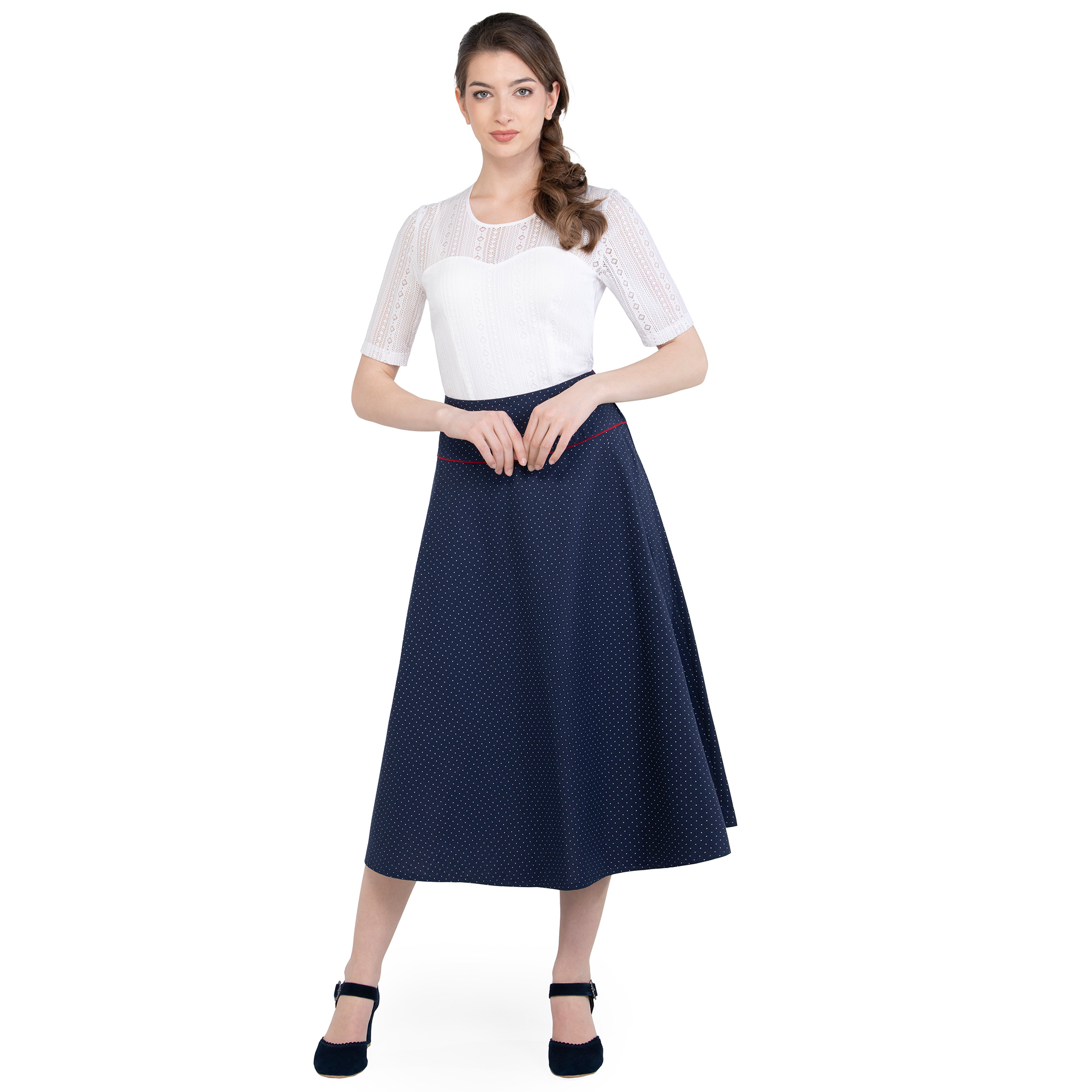 Damen Rock „Kärnten“ in Blau mit Punktmuster, A-Linie und leichten Falten. Seitlicher Reißverschluss für bequemes An- und Ausziehen – perfekt für Alltag, Büro oder festliche Anlässe.