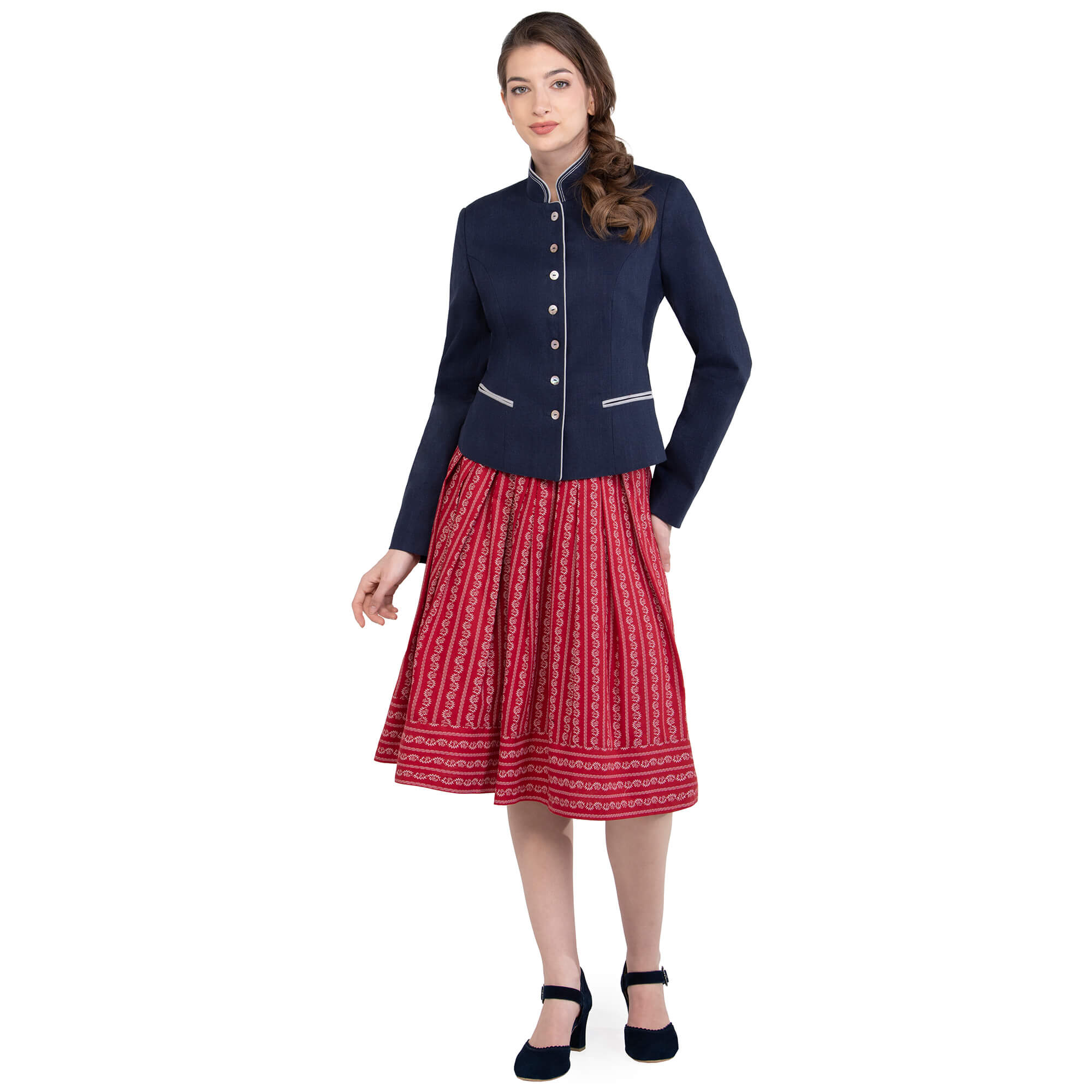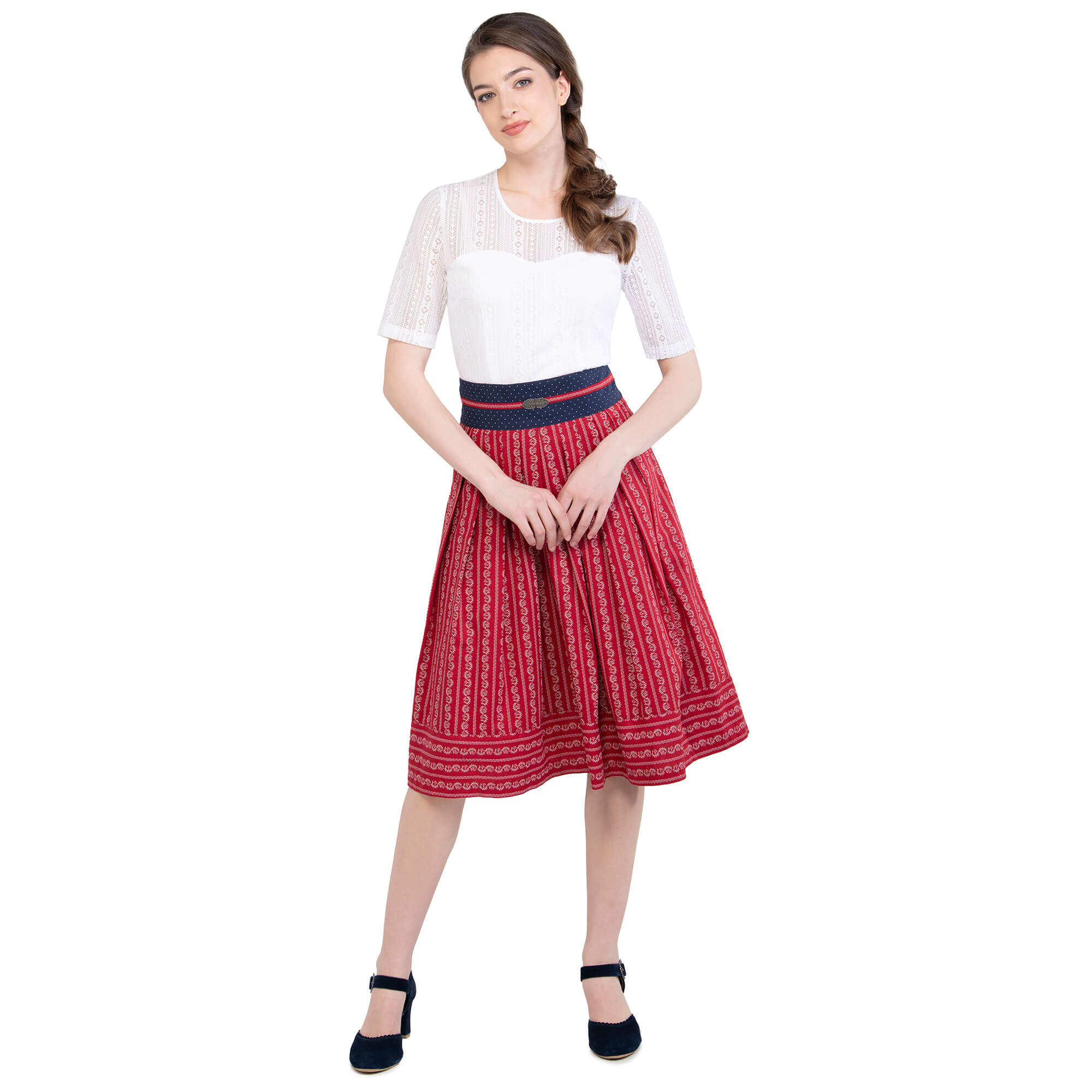 Dieser knielange Trachtenrock in strahlendem Rot besticht durch ein zartes, weißes Streublumenmuster, das ihm einen verspielten und femininen Look verleiht. Das blaue Taillenband mit dekorativer Schnalle sorgt für eine perfekte Passform und setzt die Taille elegant in Szene. Die klassische A-Linien Form lässt den Rock schön fallen und schenkt Bewegungsfreiheit sowie Komfort beim Tragen. Ob für den Alltag, die Freizeit oder festliche Anlässe – dieser Rock ist vielseitig kombinierbar und ein stilvolles Lieblingsstück für jede Gelegenheit.