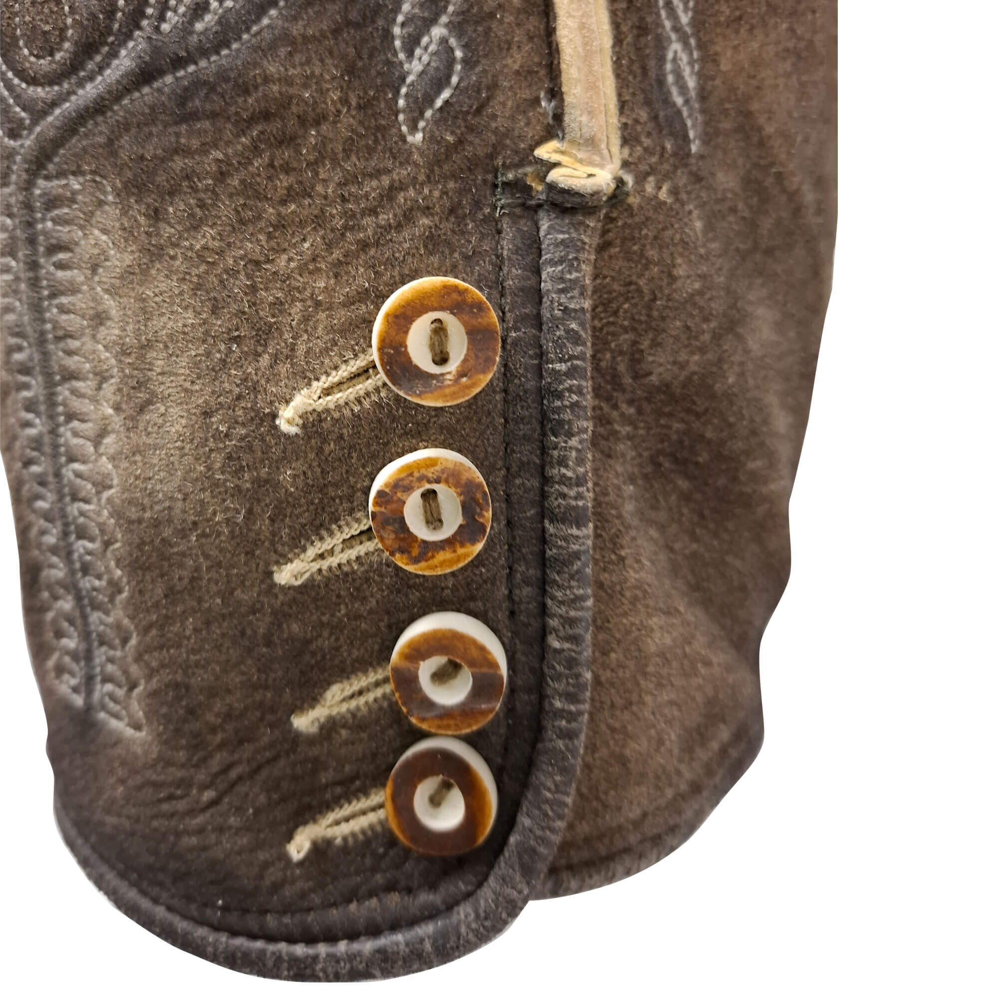 | Verschluss: | Bänder Bundmitte hinten, Knopfverschlüsse in Hirschhornoptik, Trachtengürtel |