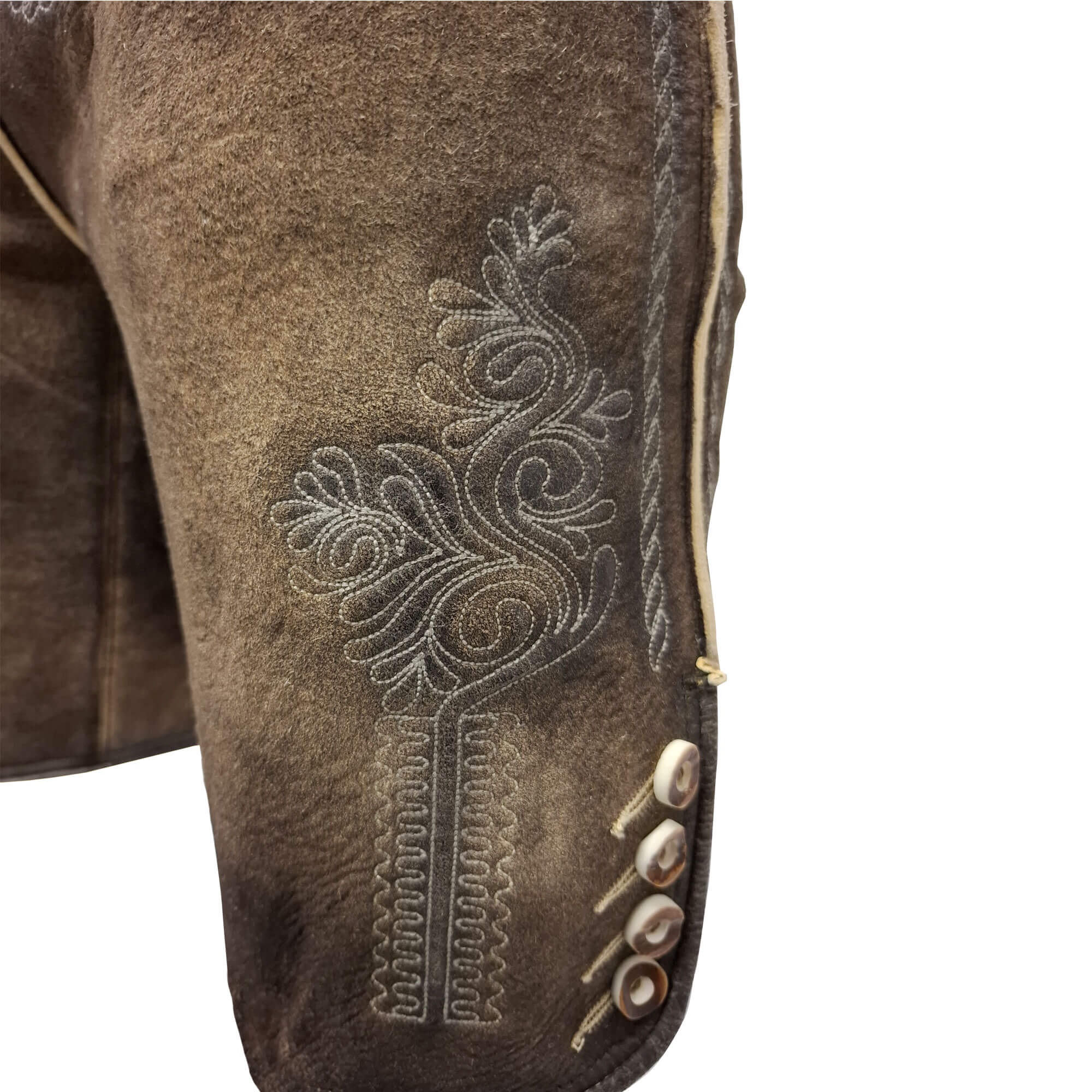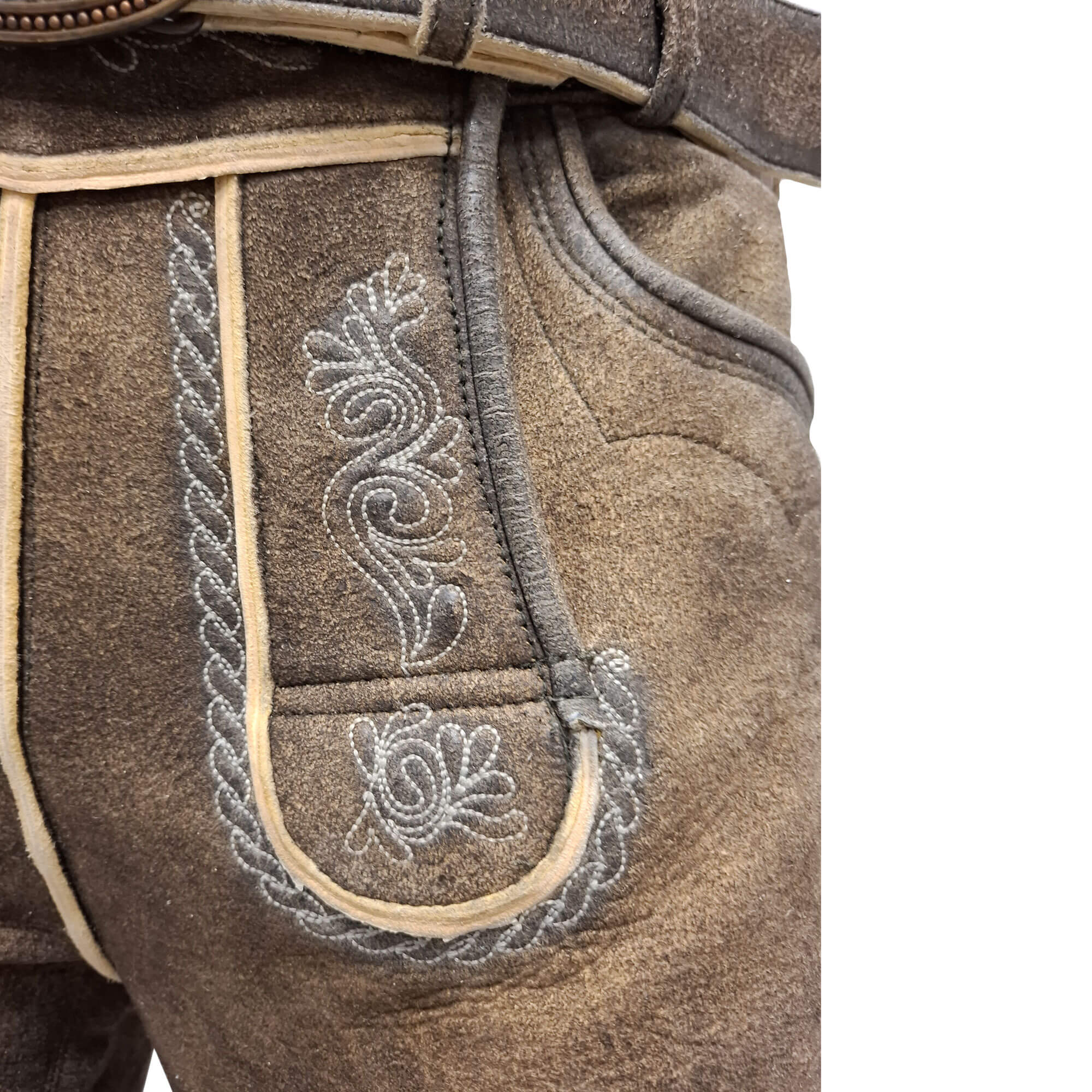 Diese traditionelle Hirschlederhose für Herren überzeugt durch ihren authentischen Look und die hochwertige Verarbeitung. Das weiche, robuste Hirschleder in einem dunklen Braunton sorgt nicht nur für höchsten Tragekomfort, sondern verleiht der Hose auch eine besonders edle und langlebige Optik. Feine Stickereien in hellem Kontrastgarn zieren die typischen Trachtenelemente – darunter die Messertasche und die geschwungenen Verzierungen an den Beinabschlüssen sowie auf dem Latz. Die aufwendig gearbeitete Paspelierung in Beige setzt stilvolle Akzente. Ein besonderer Hingucker ist der Trachtengürtel mit Metallgürtelschnalle, die das österreichische Wappen zeigt – ein Statement für Traditionsbewusstsein mit Stil.