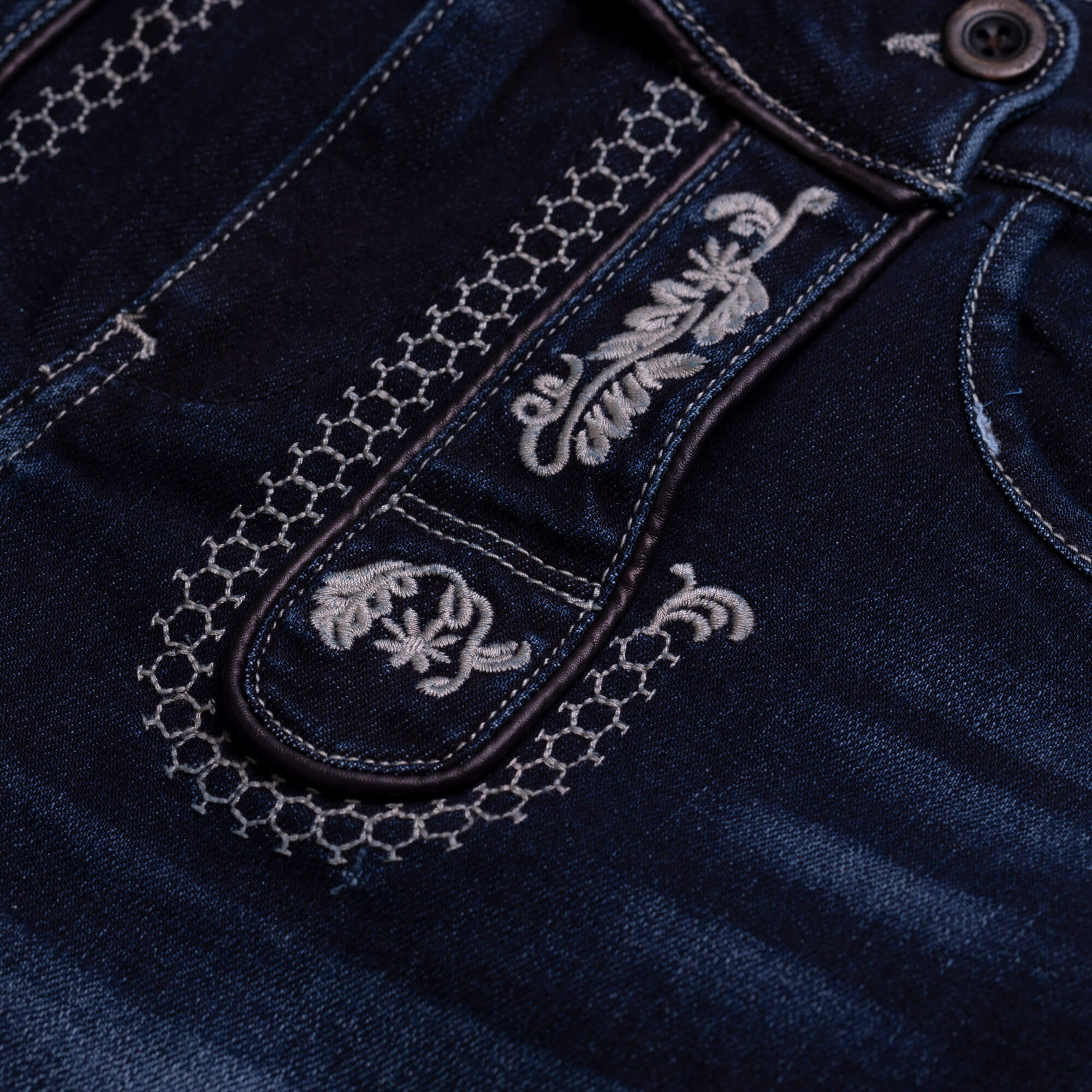 Die kurze Herren Jeans in Trachtenoptik von Blue Monkey ist in einem schönen, dunklen Jeansblau gehalten. Die Hose ist im Stil der Trachtenmode designt und hat eine schöne Stickerei vorne an beiden Beinen, was ihr besonderen Charme verleiht.
