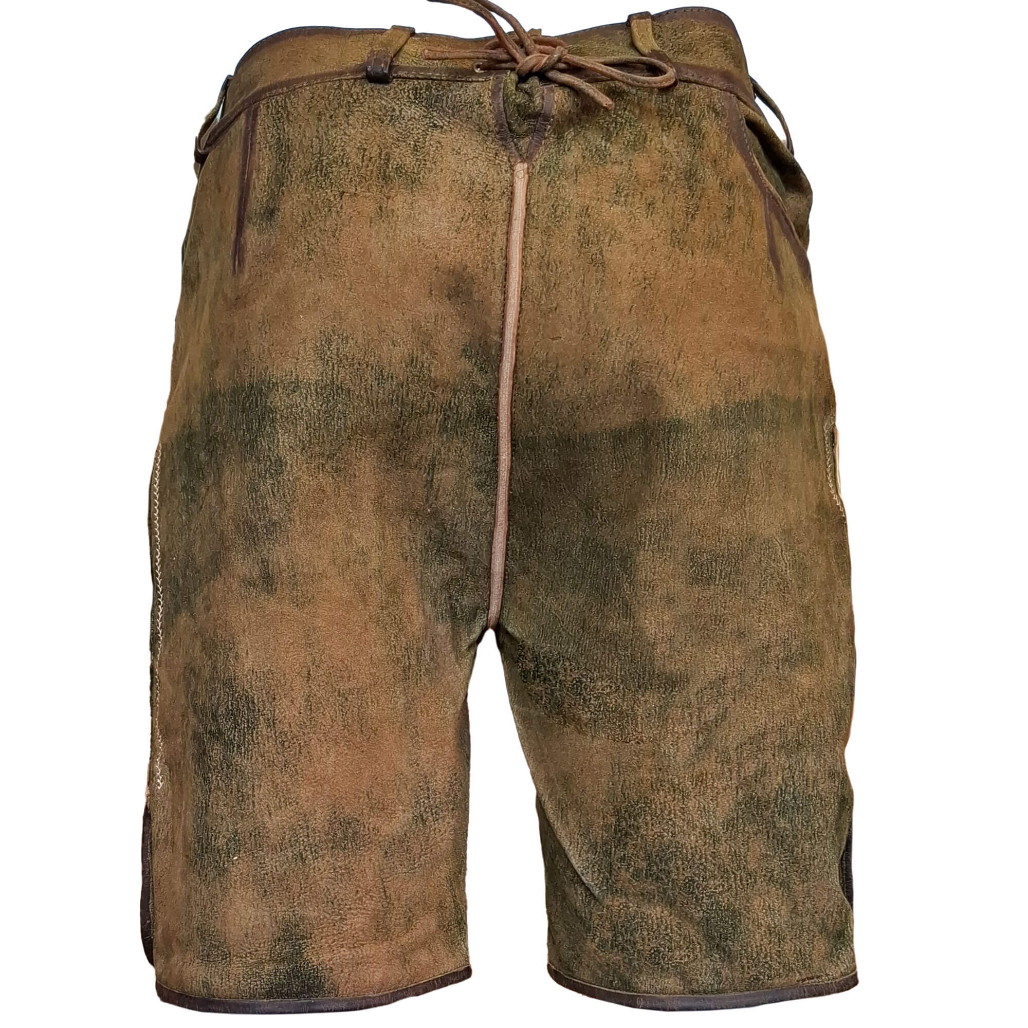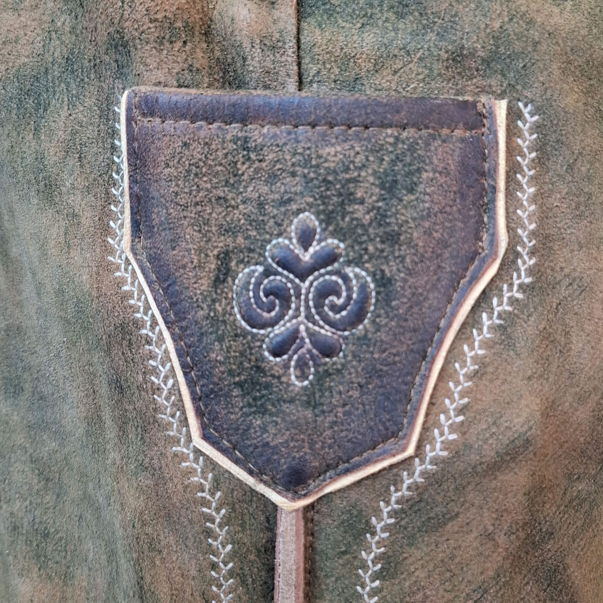 Die Lederhose „Erich“ ist ein echtes Highlight für alle, die Tradition mit Charakter verbinden möchten. Das hochwertige Ziegenleder in einem erdigen Braunton erhält durch den moosgrünen Touch eine außergewöhnliche, fast naturbelassene Optik – als käme sie direkt aus einem Forstwald.