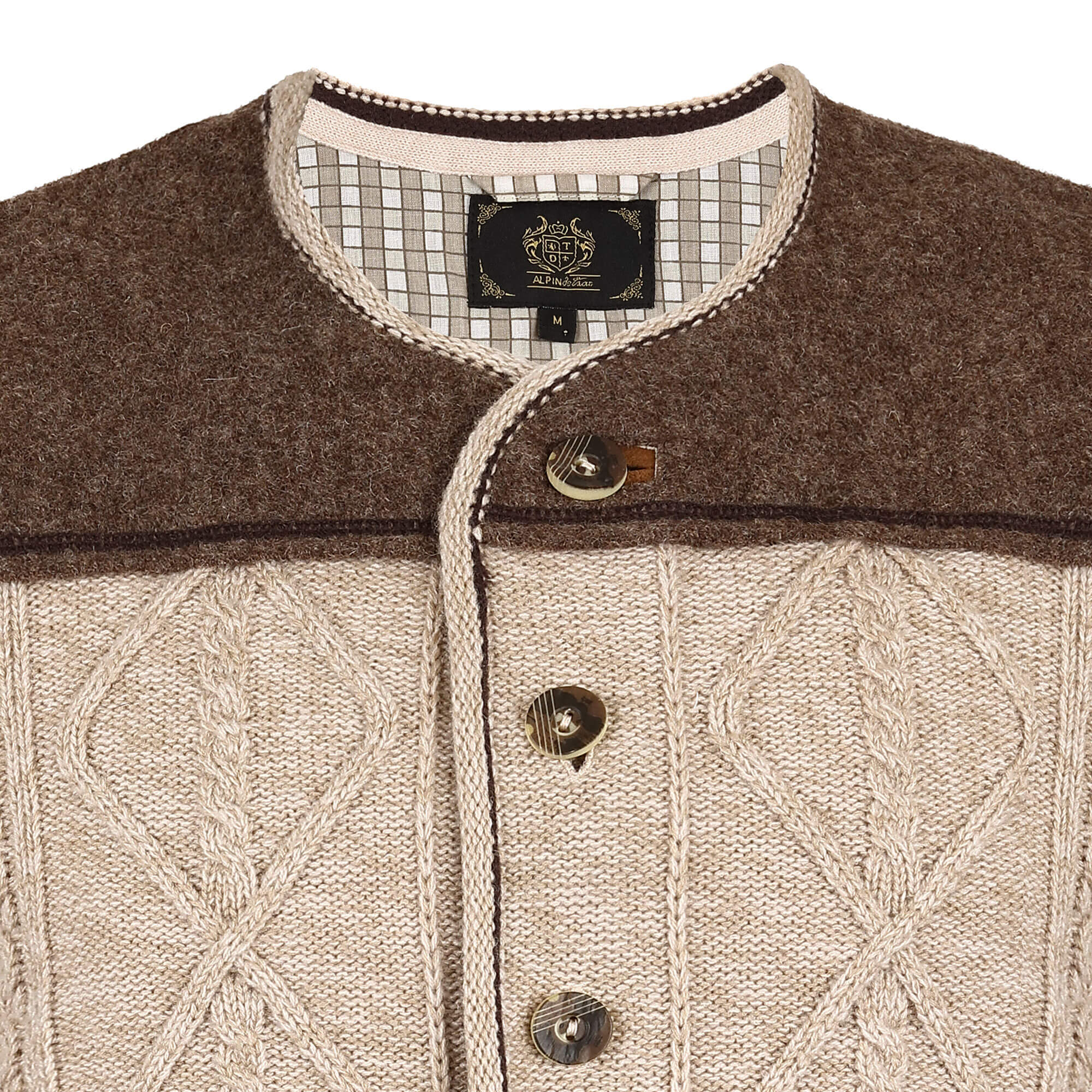 Der farblich abgesetzte Schulterbereich setzt einen dezenten, aber markanten Akzent, während die durchgehende Knopfleiste mit dekorativen Metallknöpfen das traditionelle Erscheinungsbild harmonisch abrundet. Eine kleine Logo-Applikation am seitlichen Bereich unterstreicht die Wertigkeit des Modells und fügt sich unaufdringlich in das Gesamtbild ein.