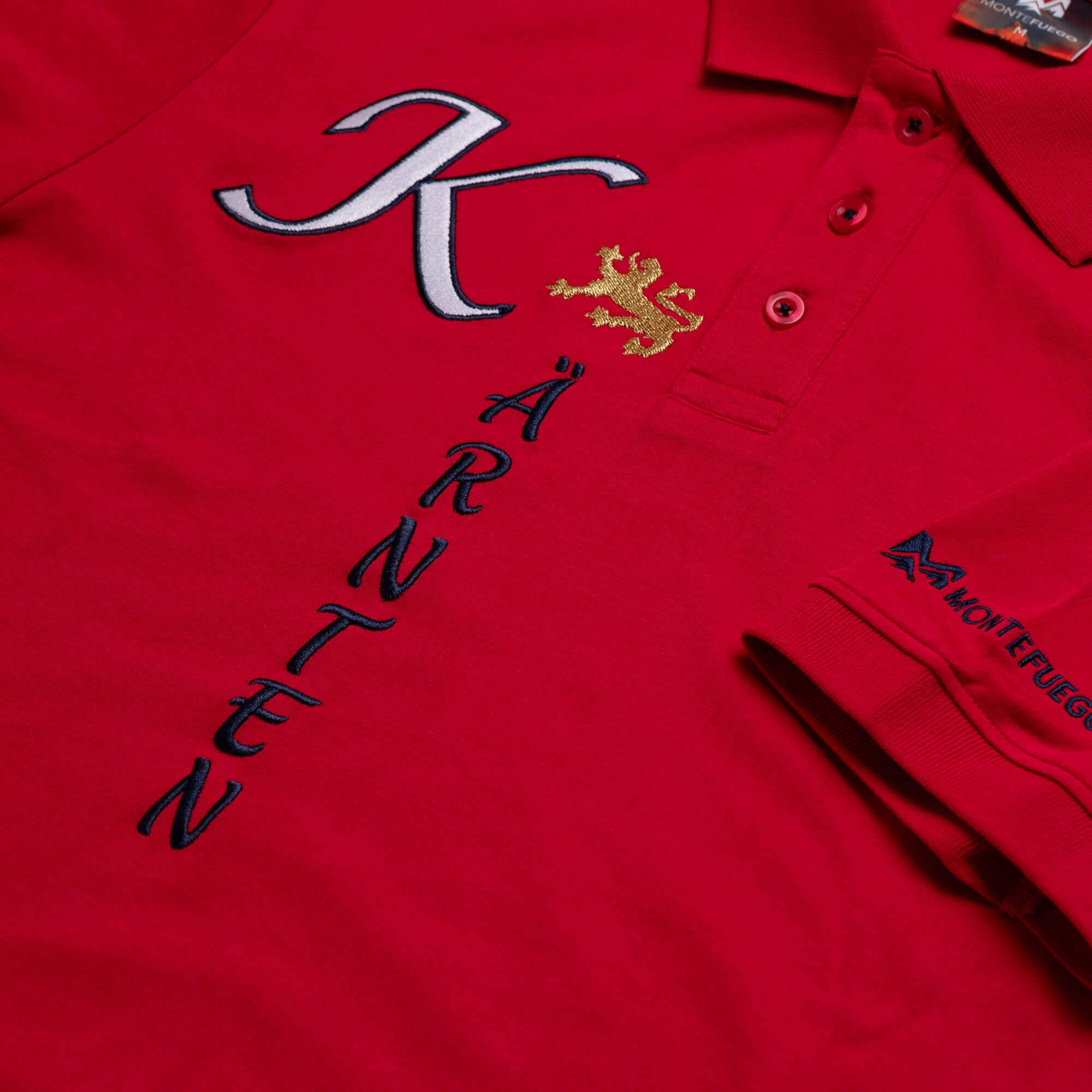 Der typische Polokragen mit Knopfleiste verleiht dem Shirt einen sportlichen Look. Auf der Vorderseite sind ein großes „K“, ein goldener Löwe und der Schriftzug „KÄRNTEN“ aufgestickt – ein echter Hingucker für alle, die ihre Heimat gerne zeigen.